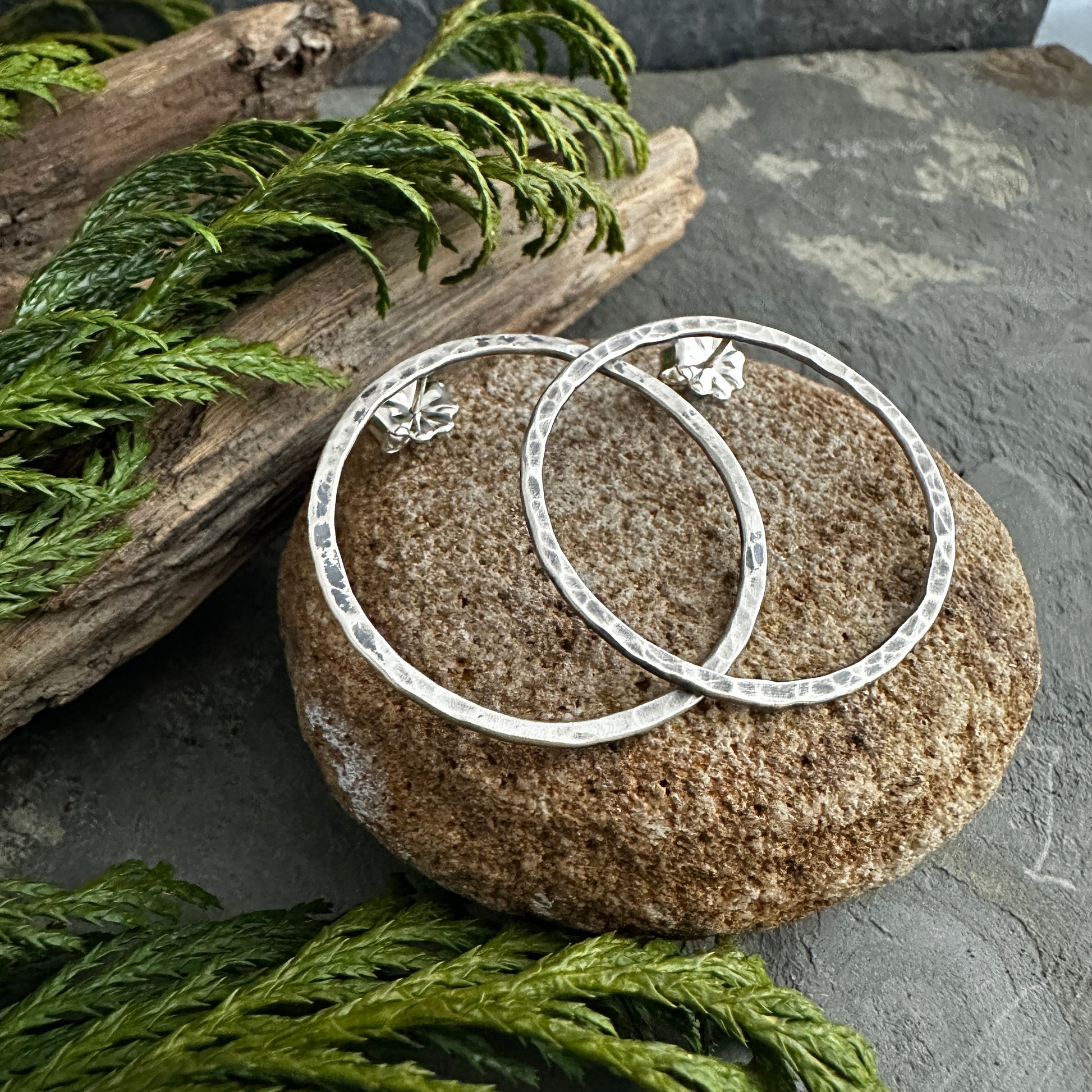 These hand hammered hoops have sterling silver posts and backs.