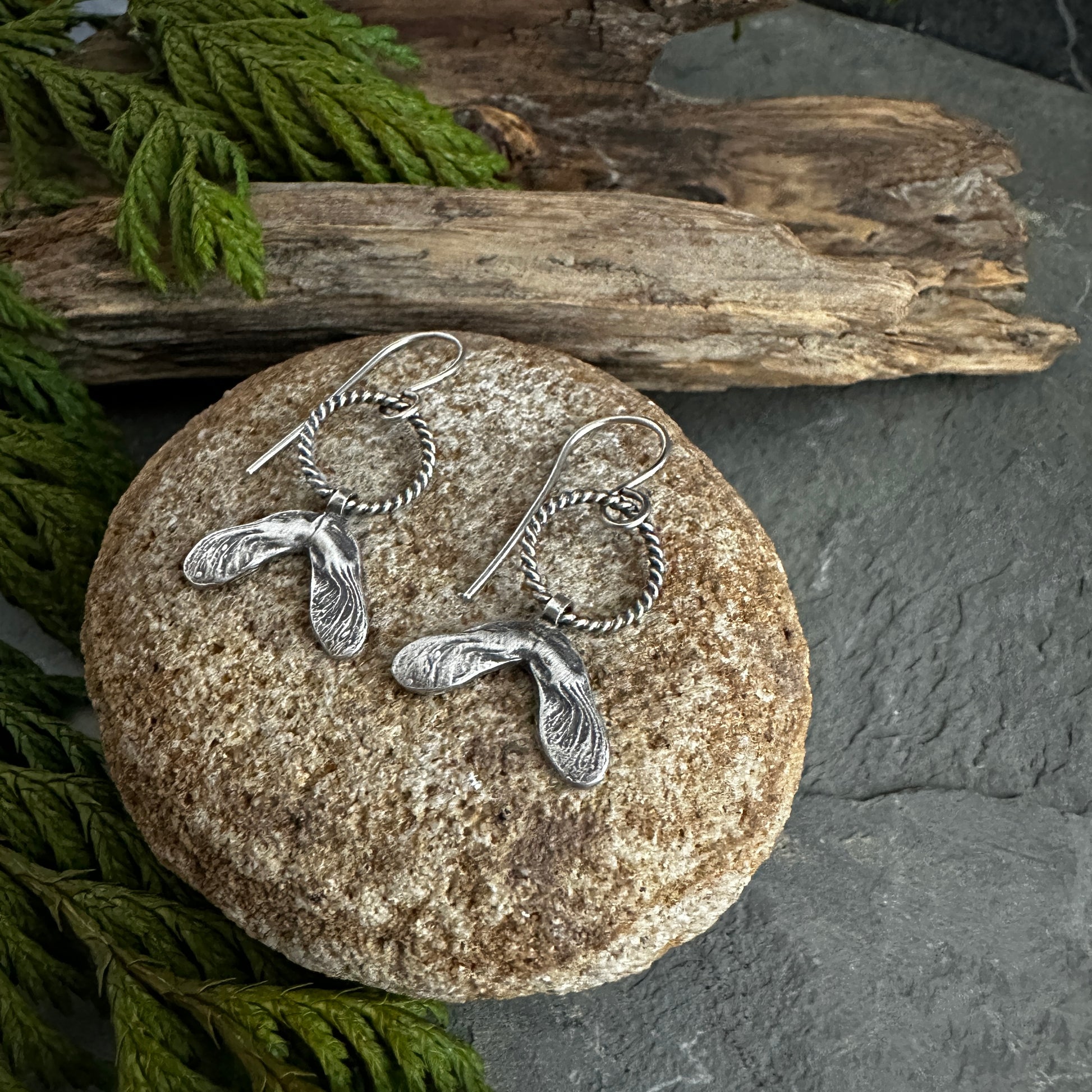 Maple seeds are captured in sterling silver and hang from sterling silver twisted wire circles.